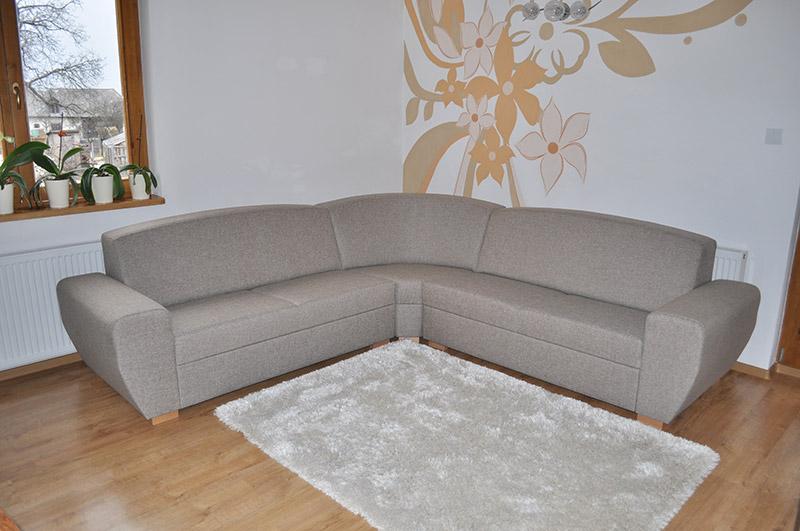 Girona v tomto interiéri je súčasťou veľmi kreatívneho celku. Dominantou je práve rohová sedacia súprava. Roh je tvorený veľkým operadlovým oblúkom opticky zväčšujúcim priestor na sedenie. Ďalšou inovatívnou myšlienkou, ktorá vás zaujme na prvý pohľad je grafický nápad na stene za sedačkou. Je tvorený jednoduchými kvetmi okrovej a bledej farby. Do ich stredu sú vsadené tri nástenné lampy. Majú najmä praktickú funkciu. Sedačka je pomerne masívna vďaka širokým operadlám a podrúčkam, ktoré sa smerom dolu zľahka zužujú. Nasadajú na drevené nohy, ktoré spolu s kostrou zaručujú stabilitu a pevnosť súpravy. Farebne sú takmer identické s plávajúcou podlahou. Poťahová látka je béžovo-hnedý textilný materiál. Veľmi precíznu a presnú čalúnnickú prácu je vidieť na prvý pohľad.